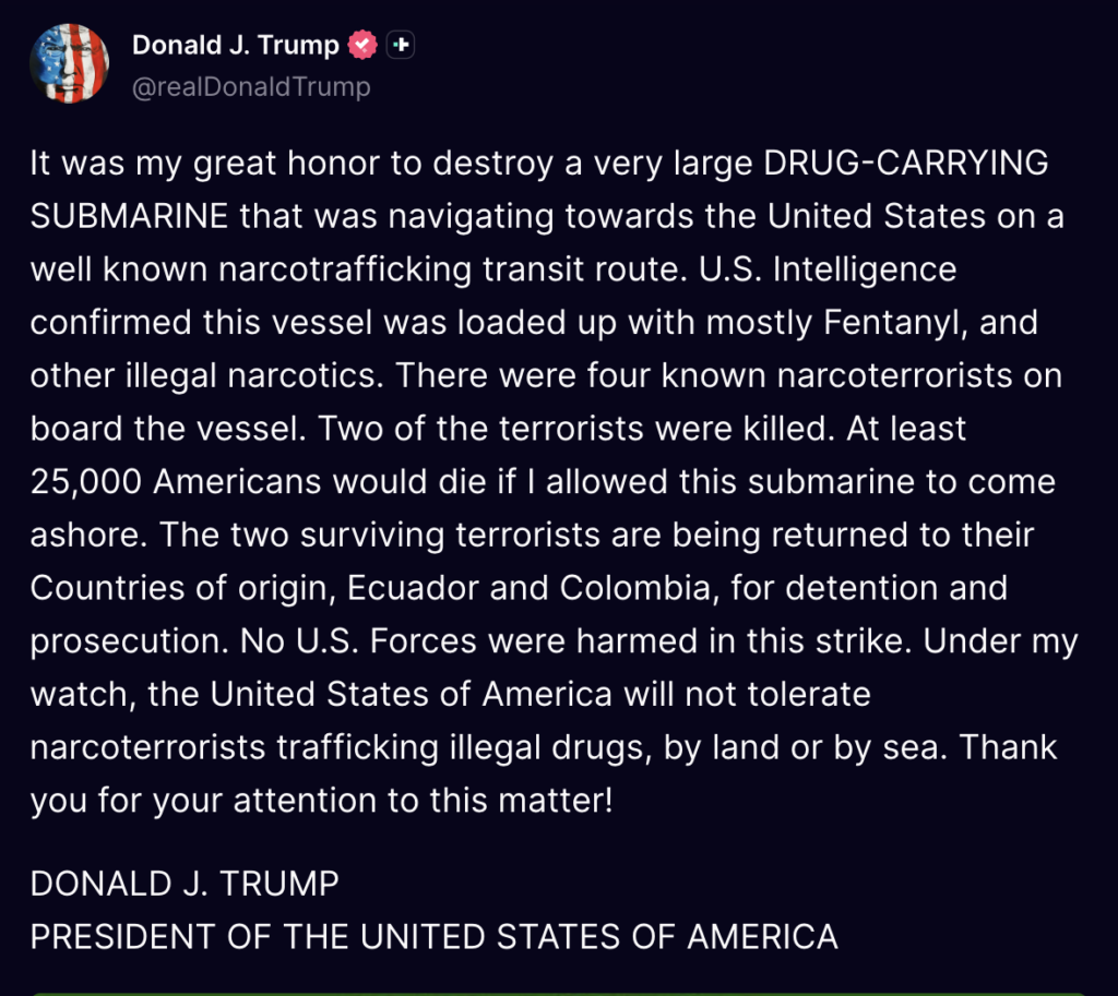 On Saturday, Trump wrote on Truth Social, "It was my great honor to destroy a very large DRUG-CARRYING SUBMARINE that was navigating towards the United States on a well-known narcotrafficking transit route."