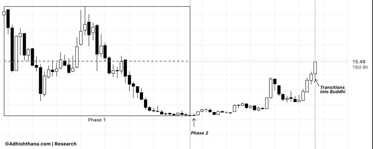 While the stock appeared to rally during its Sankhya period, over 80% of that Sankhya period was characterized by consolidation, not directional momentum. This supports the case that the current rally represents a legitimate Buddhi-phase breakout, not an overextended move, further making the case stronger for the bulls.